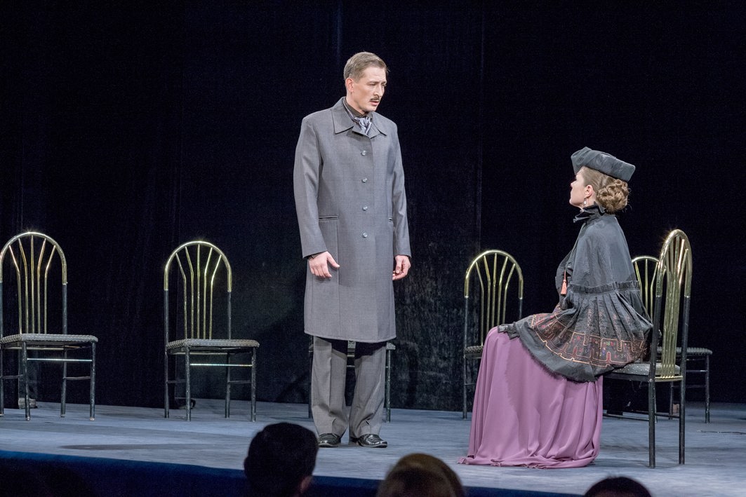 … У сценографії вистави вірно вгадано «залізну» погрозу живому життю, опозицію «живе-залізне»… Подвійний ряд залізних стільців, що сходяться у перспективі під викривленим дзеркалом і блискучим залізним листом неправильної (як у зворотній перспективі) форми… І коли у фіналі виконавиця ролі Анни лягає між рядами стільців, це сценічно прочитується – між рейками. У Толстого саме між рейками – на шпали – і на коліна. Залізо з «постмодерністського» роману Толстого переходить у сценографію театру.